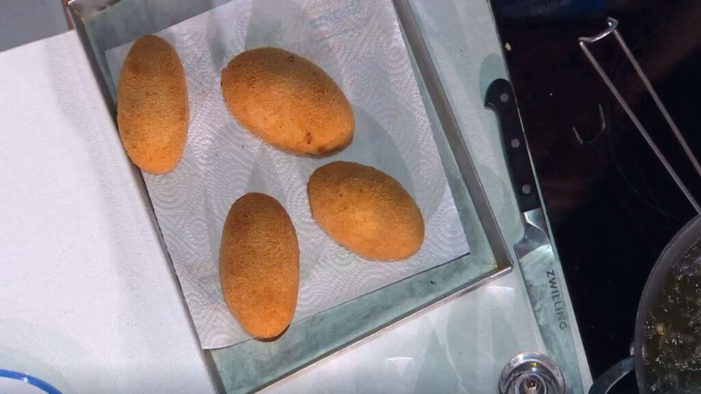 Prendete ora un pugno di impasto e stendetelo sulla palma della mano, creando un piccolo disco. Al centro di questo disco ponete un cubetto di provola o un pezzetto di prosciutto cotto, quindi richiudete l’impasto formando una pallina o un crocchè. Una volta creati i vostri crocchè, passate ciascuno di essi prima nell’albume sbattuto e poi nel pangrattato. Per una croccantezza extra, ripetete l’operazione immergendo di nuovo nei bianchi d’uovo e nel pangrattato.