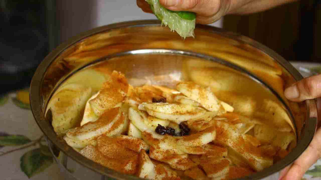 - Aggiungi il succo di limone, lo zucchero di canna e la cannella, mescolando bene per far amalgamare gli ingredienti.