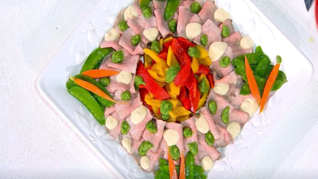 Una volta pronta la carne, affettatela sottilmente e servitela accompagnata dai peperoni, dalle taccole e dalle carote baby crude condite con olio e sale. Guarnite il piatto con la salsa di rucola e quella a base di maionese per un tocco finale di sapore.