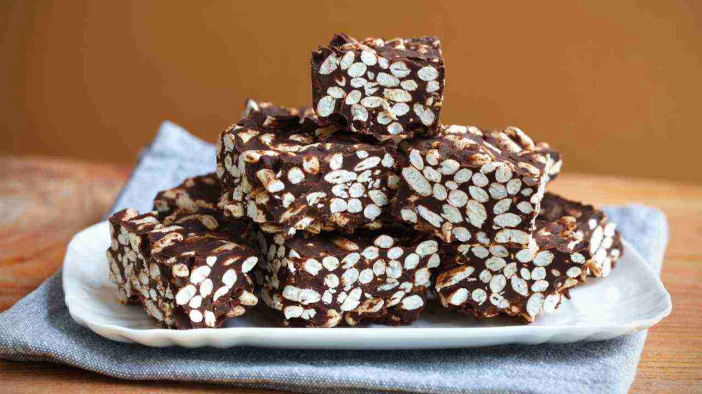 - Una volta pronte, taglia a pezzi e servi le tue barrette al cioccolato con riso soffiato!