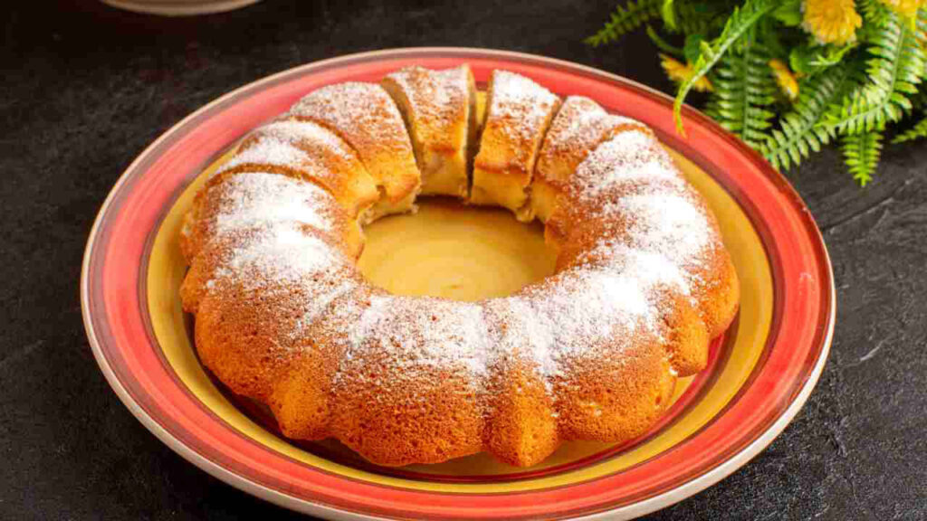 - Versa il composto nello stampo preparato e inforna per circa 40 minuti, o fino a quando la ciambella è dorata e uno stecchino inserito al centro esce pulito.