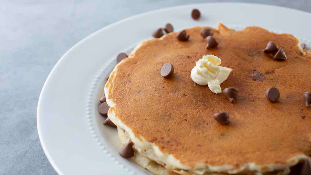 - Ripeti fino a esaurire il composto. Servi i pancake caldi con yogurt greco e gocce di cioccolato sopra.