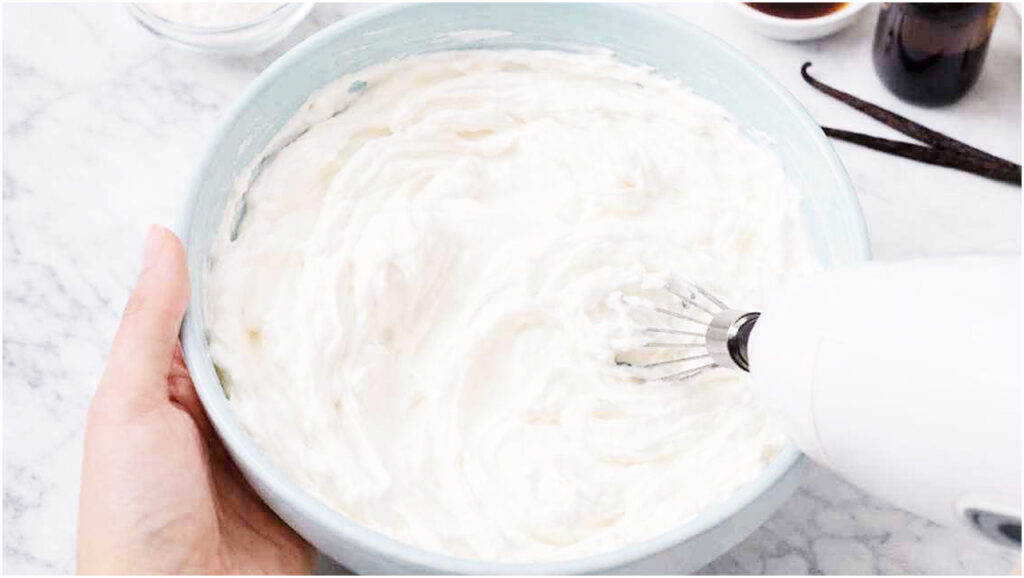 - Continua a montare la miscela fino a quando non diventa lucida e spalmabile, circa 5-10 minuti.