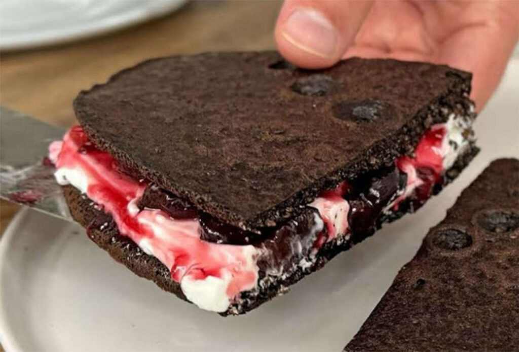 - Spalma una cucchiaiata di crema al formaggio spalmabile su ogni crepes, aggiungendo un po’ di confettura di ciliegie senza zucchero.