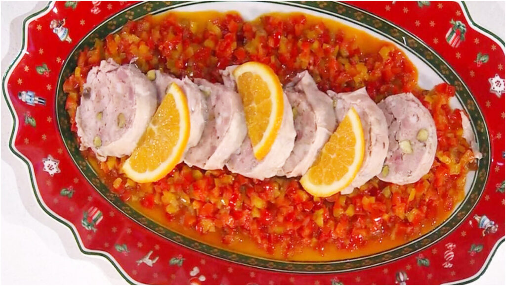 Una volta pronta, serviamo la galantina a fette su un letto di peperoni, completando il piatto con fette di arancia e un filo di aceto balsamico.