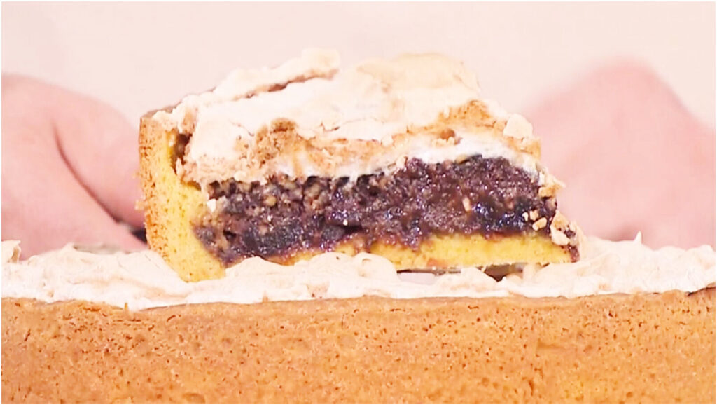 Aggiungiamo quindi la restante parte delle mandorle tritate, le amarene sciroppate e gli amaretti frantumati. Per dare un tocco di aromaticità, irroriamo con un po’ di Marsala o alchermes, per finire con una spolverata di cioccolato fondente tritato. Terminata questa fase, distribuiamo la meringa sopra il ripieno, livellandola con una spatola.