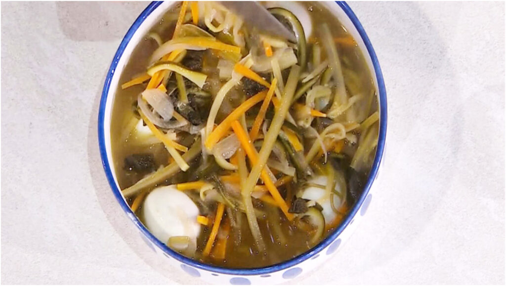 Disporre le uova fritte in una insalatiera con le uova sode sgusciate. Versa le verdure con il loro condimento ancora caldi sulle uova, coprendo bene. È fondamentale lasciare riposare in frigorifero per una notte: questo passaggio permette ai sapori di amalgamarsi perfettamente.