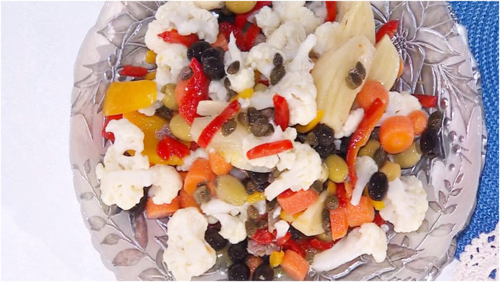 Prendiamo ora una ciotola capiente e uniamo gli ingredienti principali: la giardiniera ben scolata, le olive verdi e nere, i capperi sciacquati sotto acqua corrente, i peperoni sott’olio e il cavolfiore precedentemente sbollentato. Aggiungiamo l’emulsione di olio, aceto e acciughe, quindi mescoliamo delicatamente fino a combinare tutti gli ingredienti. Questa insalata si conserva bene in frigorifero per diversi giorni, rendendola perfetta per essere preparata in anticipo.