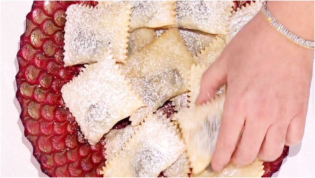 Dopo aver steso la sfoglia, distribuiamo dei piccoli mucchietti di ripieno sulla superficie. Ripieghiamo quindi la sfoglia sul ripieno, premendo delicatamente per rimuovere l’aria e sigillare bene i bordi. Con un coltello o una rotella, ritagliamo i tortelli e friggiamoli in olio profondo o strutto fino a doratura. Scoliamo i turtlitt su carta assorbente e spolveriamo con abbondante zucchero a velo prima di servire.