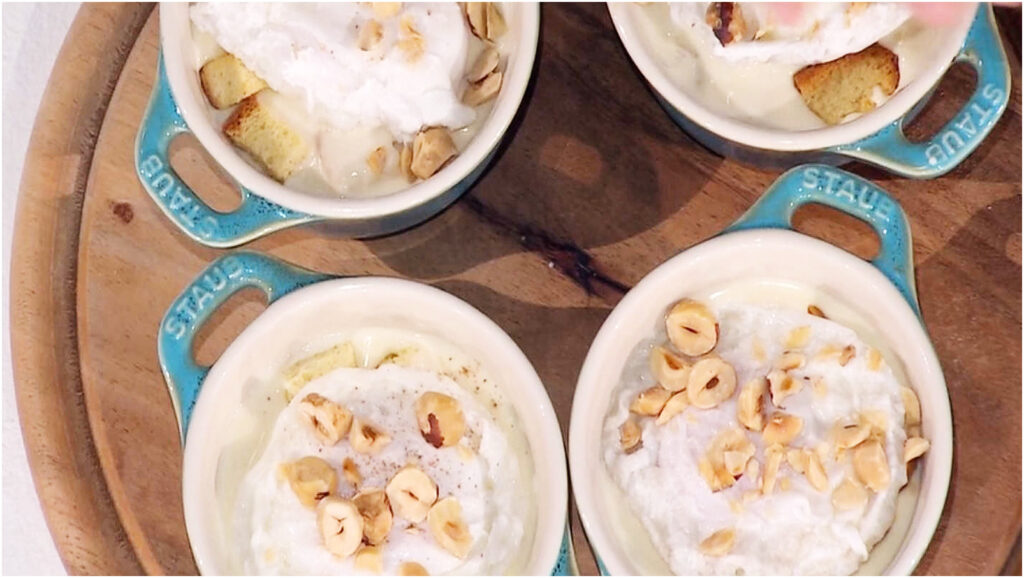 Per assemblare il piatto, prendiamo delle cocottine e disponiamo dei crostini di pane sul fondo. Versiamo un mestolo di fonduta di Piave su ciascun crostino e adagiamo sopra l’uovo in camicia. Completiamo il piatto con nocciole tostate tritate e una leggera spolverata di noce moscata per un tocco aromatico. Servite immediatamente, per gustare al meglio la cremosità della fonduta e la delicatezza dell’uovo.