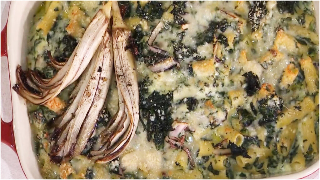 Infine, uniamo i maccheroni alla besciamella e alle verdure, mescolando bene per far amalgamare tutti gli ingredienti. Trasferiamo il composto in una pirofila e copriamo con abbondante formaggio grattugiato. Inforniamo in forno statico a 220° per 15 minuti, fino a ottenere una bella crosticina dorata. Serviamo con il radicchio cotto in forno, che aggiungerà un tocco di colore e sapore al piatto.