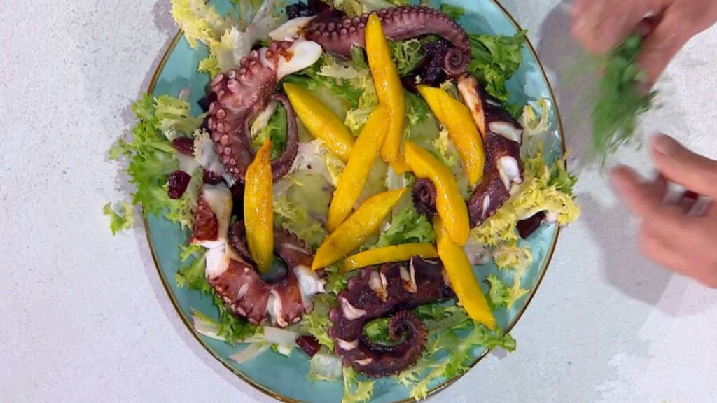 Scolate il polpo e tagliate i tentacoli, quindi fateli rosolare in padella con un buon filo d’olio e rosmarino fresco fino a farli dorare. Nel frattempo, prendete un mango maturo e tagliatelo a spicchi, successivamente caramellatelo in padella con dello zucchero di canna fino a ottenere una consistenza morbida e appiccicosa.
