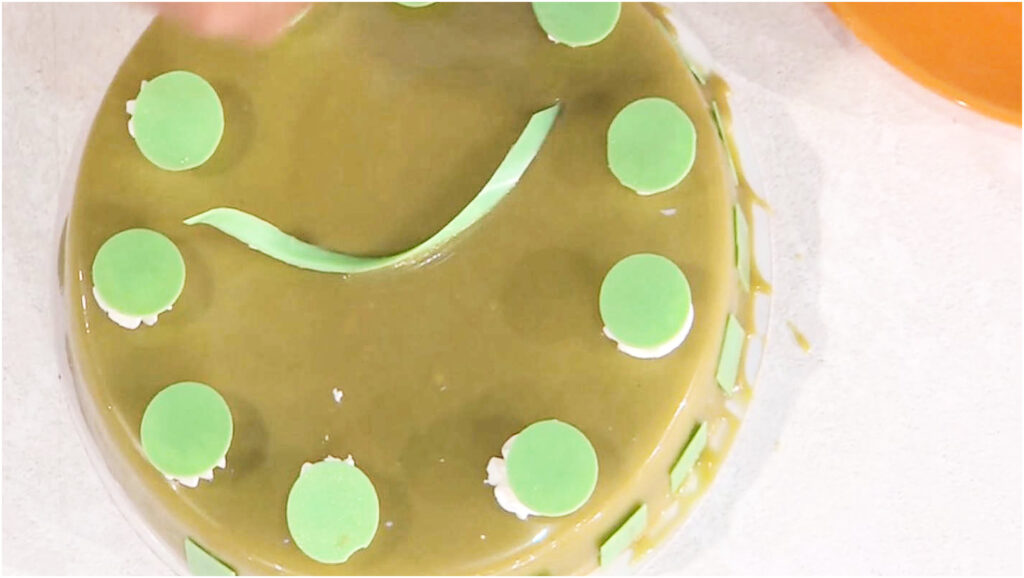 Per preparare la glassa, riscaldate a fiamma dolce l’acqua con il latte, lo zucchero, il latte condensato, lo sciroppo di glucosio, la pasta di pistacchio, la gelatina neutra e quella già ammorbidita. Unite il burro di cacao e il cioccolato bianco fuso, mescolando fino a raggiungere i 102°C. Lasciate riposare questa glassa per tutta la notte.