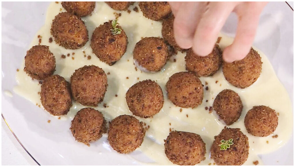 Nel frattempo, cuoci le patate al vapore. Una volta cotte, tagliale a metà e fallo arrostire in padella. Aggiungi alla polpa ottenuta dell’olio profumato all’aglio e rosmarino, e pepe macinato. Con questa preparazione, forma delle palline e rotolale nella polvere di porcini secchi. Servi le patate adornate con la “terra” e completa il piatto con la salsa al parmigiano preparata in precedenza.