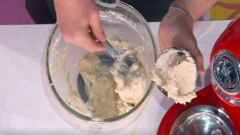 Iniziamo preparando la base del nostro burro montato, partendo dal burro morbido. È fondamentale che il burro sia a temperatura ambiente per facilitare l’operazione di montatura. Con l’aiuto di fruste elettriche, iniziamo a montare il burro fino a ottenere una consistenza cremosa e spumosa.
