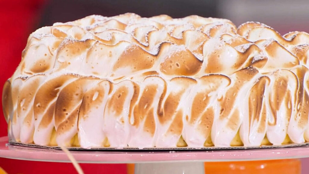Quando il dolce è ben freddo, sformiamolo e adagiamolo su un vassoio. Copriamo con la meringa e, usando un cannello, doriamo la superficie per renderla croccante e dorata.