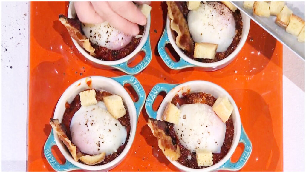 Ora che il sugo è pronto e le uova sono cotte, prendi delle cocottine. In ognuna di esse, versa un bel mestolo di sugo all’amatriciana, adagia sopra un uovo poché e spolvera generosamente con pecorino romano grattugiato. Infine, completa il piatto con del guanciale croccante, dei crostini di pane e una spolverata di pepe nero macinato per un tocco di sapore extra. Servi immediatamente per una delizia da gustare al meglio!