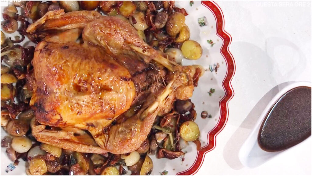 Per contornare il piatto, su una teglia foderata con carta forno, sistemate le cipolline borettane, le castagne sbucciate, le patate novelle (pulite ma con la buccia), delle foglie di salvia e dei cubetti di burro. Se vi piace, aggiungete anche della pancetta affumicata. Condite con sale e pepe e infornate a 165°C per circa 40 minuti.
