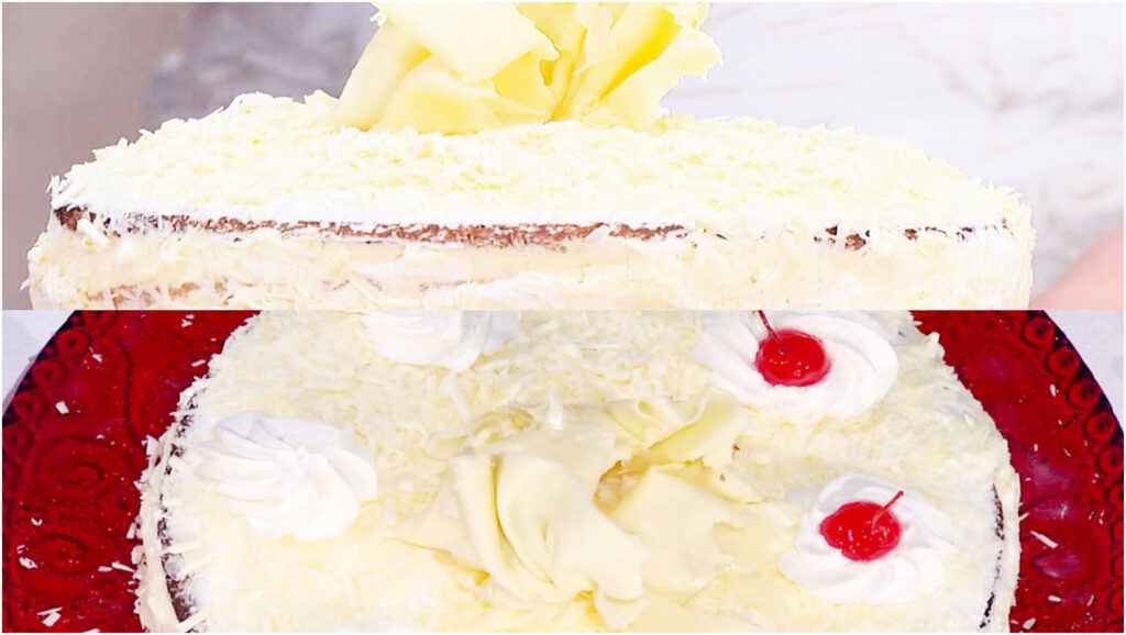 Applicando la crema rimasta sui lati, poniamo la torta in frigorifero per qualche ora per farla rapprendere. Poco prima di servire, decoriamo la superficie della torta con panna montata o con la crema avanzata e cospargiamo completamente con il cioccolato bianco tritato.