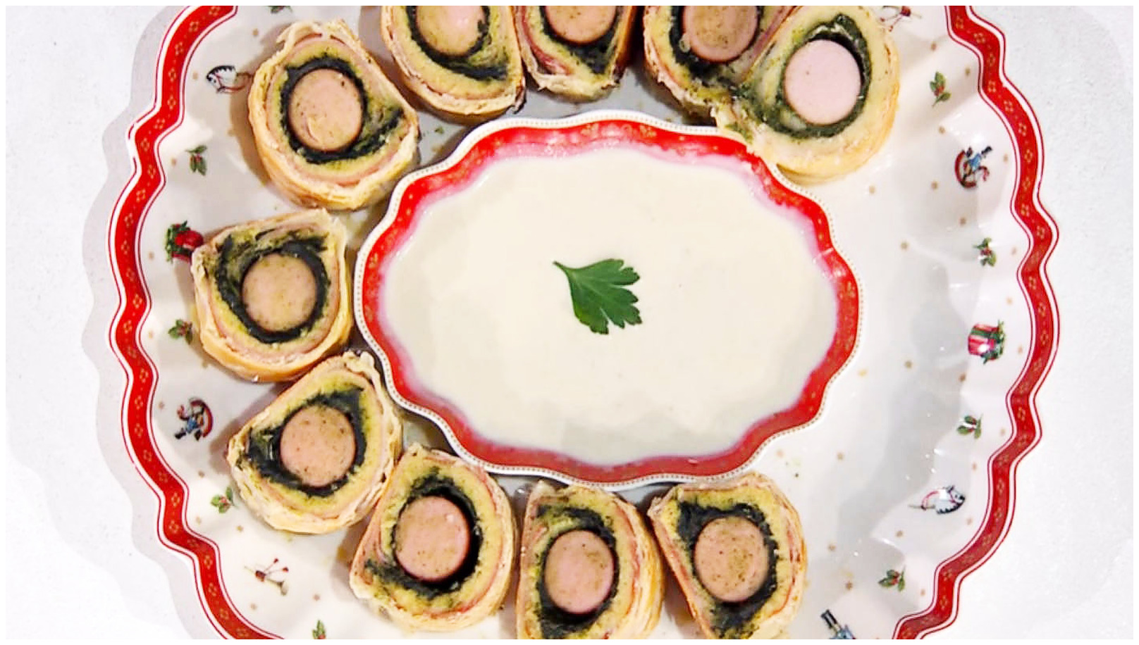 A questo punto, srotolate la pasta sfoglia su una placca da forno, creando un fondo uniforme con le fette di pancetta. Spalmate il composto di patate sulla base, poi distribuitevi sopra il mix di spinaci frullati. Infine, aggiungete i wurstel interi, che avete precedentemente sbollentato in acqua per circa 4 minuti.