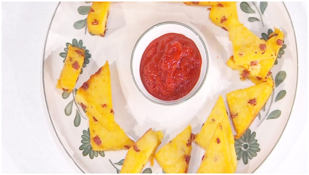 Una volta che la polenta è ben fredda, la sformiamo e la tagliamo in triangolini. Prepariamo una padella profonda con abbondante olio caldo e, quando raggiunge la temperatura ideale, friggiamo i triangolini fino a doratura, girandoli con attenzione affinché cuociano in modo uniforme.
