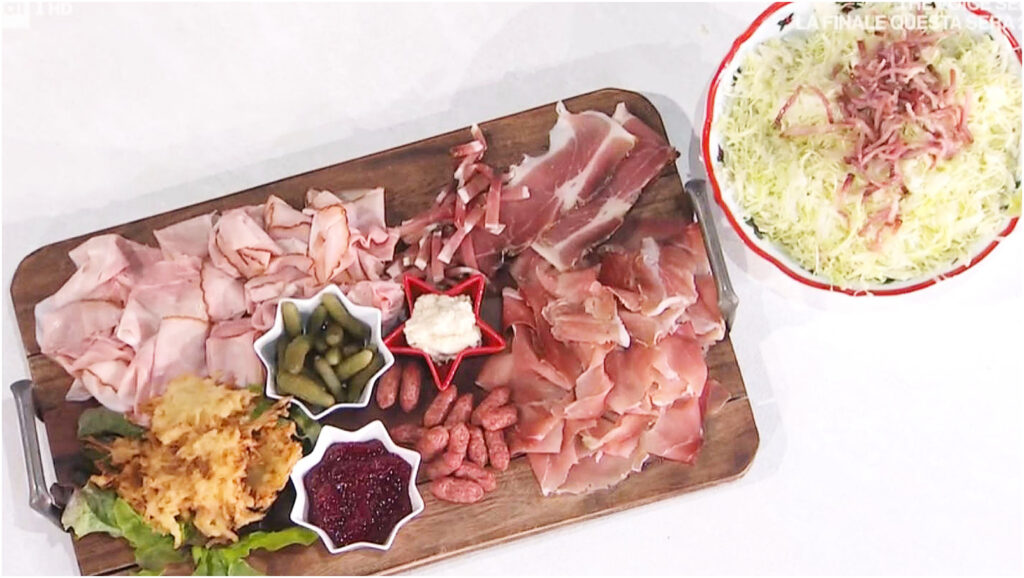 Ora, per servire, create un elegante tagliere da portata. Disponete le frittelle di tortei al centro e circondatele con fettine di speck crudo, salamini affumicati interi, listarelle di speck al naturale e fette di prosciutto affumicato. Non dimenticate l’insalata verde, tre ciotoline con rafano, cetriolini e confettura di mirtilli rossi, il tutto accompagnato dall’insalata di crauti con lo speck.