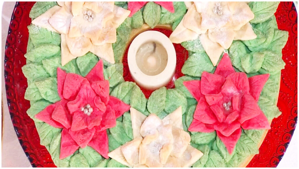 Aggiungi i fiori decorativi sulla superficie della frolla verde e cuoci in forno a 140°C per 30 minuti. Il risultato sarà un’opera d’arte dolciaria perfetta per il tuo Natale!