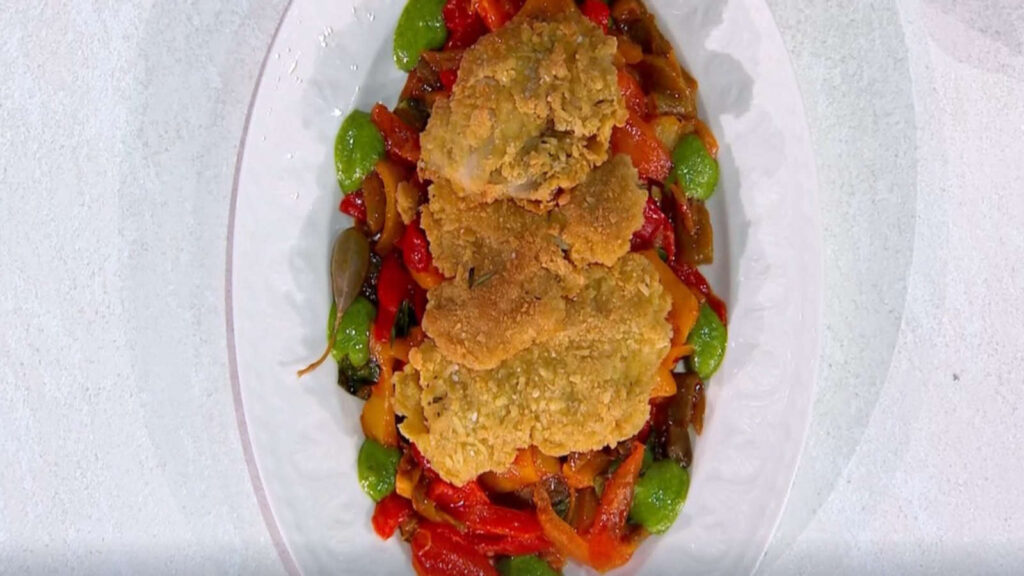 Infine, serviamo il pollo fritto su un letto di peperoni e guarniamo con il pesto di rucola, creando un contrasto di sapori e colori irresistibili.