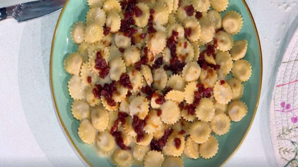 In una padella antiaderente, sciogliamo un po’ di burro e inseriamo un mestolo di acqua di cottura della pasta per non far bruciare il burro. Aggiungiamo i bottoni lessati e li saltami delicatamente, aggiungendo un altro po’ di formaggio grattugiato fino a ottenere una cremosità. Impiattiamo e decoriamo con qualche cucchiaio di cipolla al balsamico.