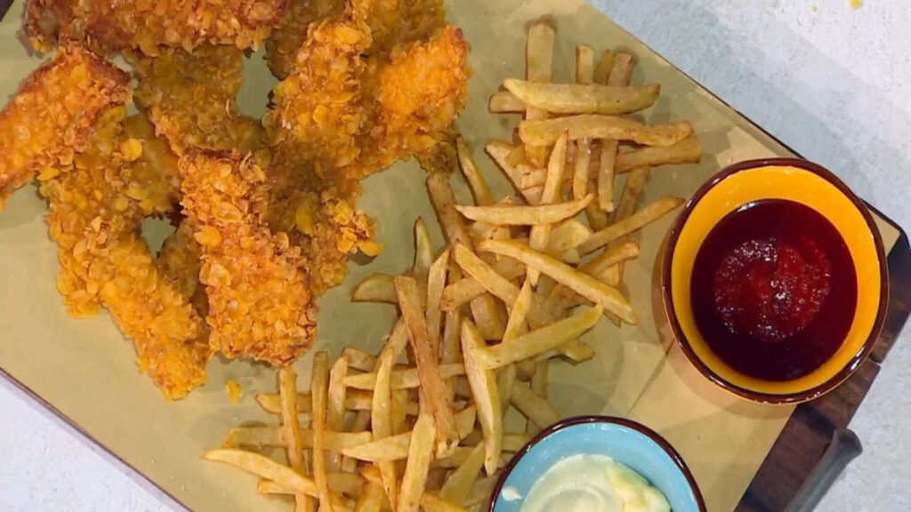 Successivamente, prendiamo il pollo marinato e procediamo alla panatura. In un piatto, uniamo farina e paprica; in un altro, sbattiamo le uova con una presa di sale. Infine, in un terzo piatto, sbricioliamo i corn flakes. Passiamo il pollo prima nella farina, poi nell’uovo e infine nei corn flakes, premendo bene affinché la panatura aderisca.