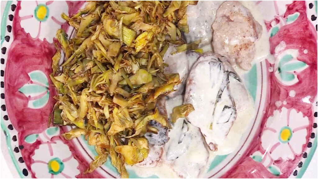 Nel frattempo, prendiamo i carciofi, puliamoli e affettiamoli finemente. Scaldiamo una padella e versiamo un generoso filo d’olio con uno spicchio d’aglio schiacciato; una volta caldo, aggiungiamo i carciofi. Durante la cottura, condiamo con sale e pepe, facendo attenzione a mantenere la croccantezza delle verdure. Cuociamo fino a doratura, poi mettiamo da parte.