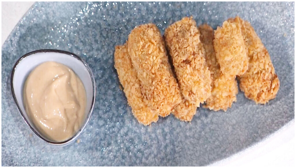 Per il condimento, mescolate maionese e salsa tonkatsu. Servite le vostre crocchette giapponesi calde, accompagnate dalla salsa preparata.