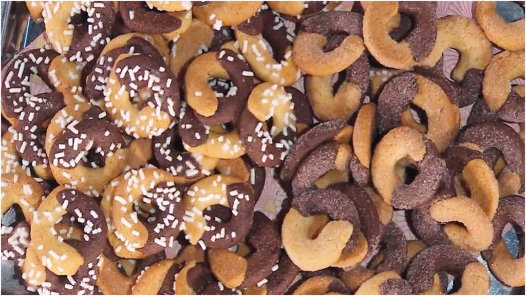 A questo punto, sei pronto per formare le ciambelline! Prendi entrambi gli impasti e, con le mani, crea dei serpentelli sottili di circa 8 cm. Una volta ottenuti, forma le ciambelline alternando i pezzi di impasto bianco e al cacao, proprio come nei tradizionali biscotti. Per rifinire, inumidisci la superficie delle ciambelline con un poco d’acqua e passale nella granella di zucchero o nello zucchero semolato.