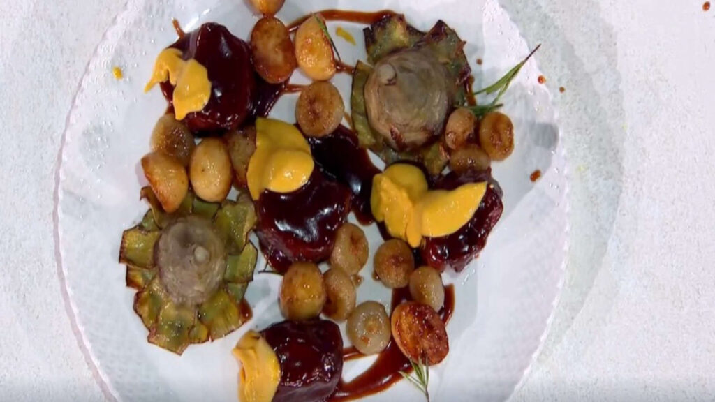 Dopo la cottura, estraiamo le cipolline, le patate e i carciofi dal pentolino e trasferiamoli in una padella con un altro filo d’olio per dorarli perfettamente. Mentre le verdure si rosolano, passiamo alla carne: tagliamo il filetto a cubetti, infariniamolo leggermente e scaldimo una padella con burro e olio. Aggiungiamo rosmarino e salvia e facciamo rosolare il filetto su tutti i lati. Una volta ben dorato, sfumiamo con del vino rosso e uniamo il concentrato di pomodoro, aggiustando di sale. Lasciamo cuocere il tutto per 20 minuti a fiamma vivace.