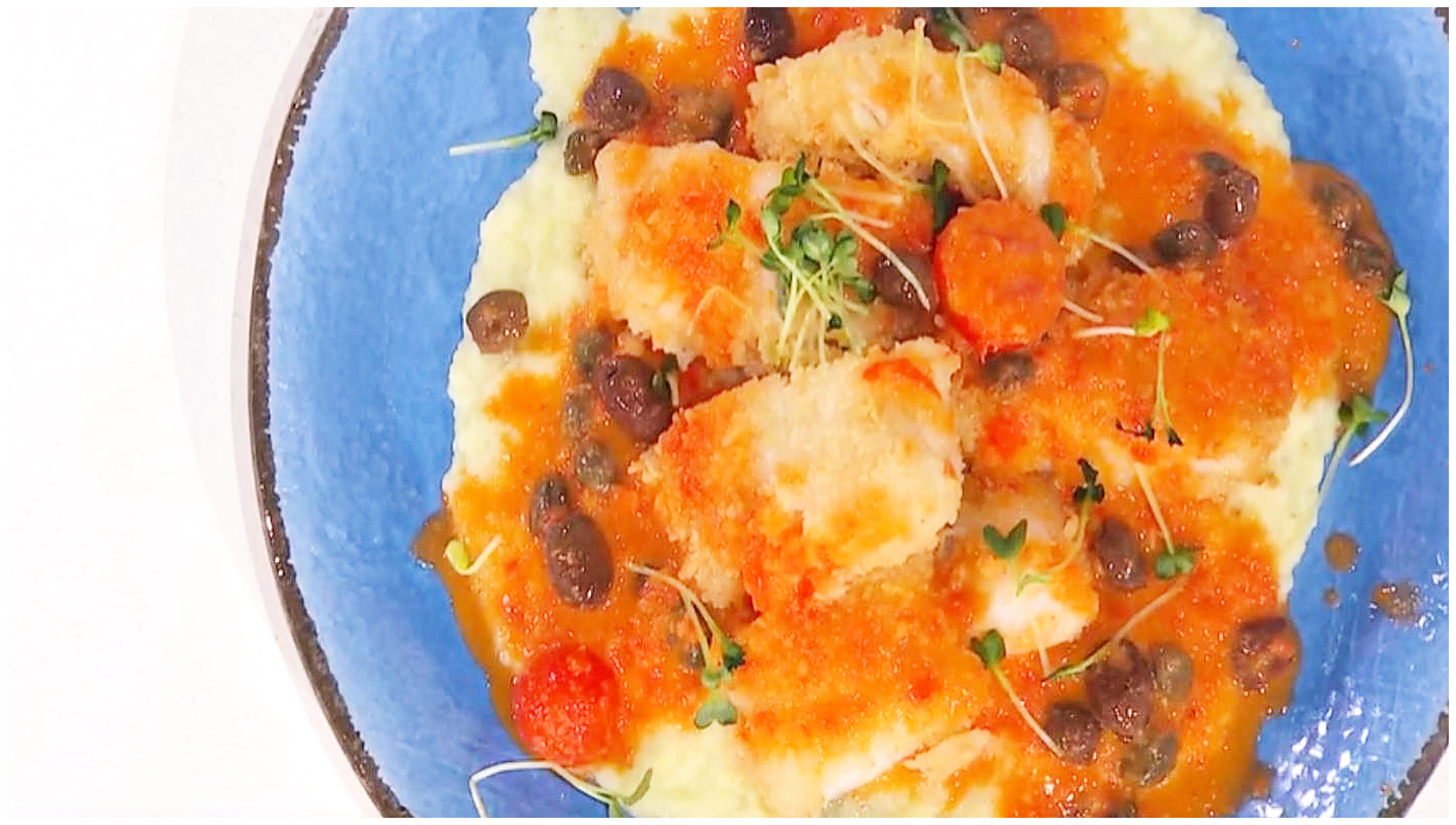 Servite il baccalà fritto su un morbido letto di purè di patate, versando sopra la salsa di pomodoro arricchita con capperi e olive. Un piatto perfetto per portare il sole del Mediterraneo in tavola!
