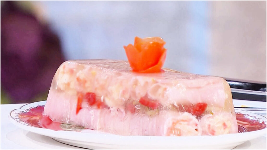 Prepara uno stampo da plumcake rivestito con pellicola trasparente. Sul fondo, posiziona 4 fettine di uova sode agli angoli. Aggiungi due cannelloni di prosciutto al centro e versa un po’ di gelatina liquida, facendo attenzione che sia fredda, a coprire i cannelloni. Completa con pezzetti di peperone sott’olio, cetriolini e ulteriori fettine di uova sode. Metti tutto in frigorifero a rassodare.