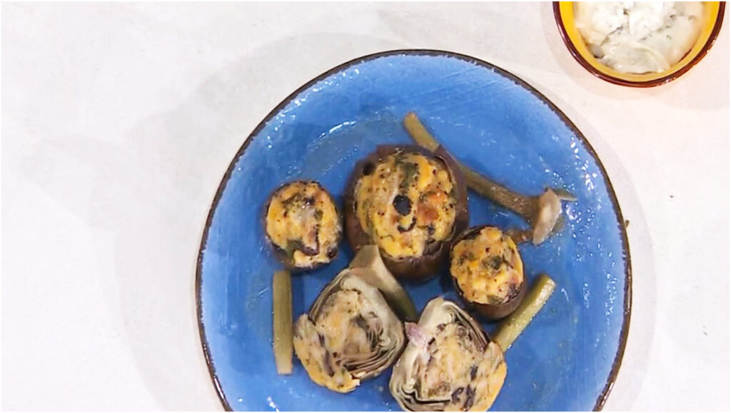 Prendiamo i carciofi e riempiamoli con il ripieno, creando una cupoletta sulla parte superiore. Disponiamoli in una pirofila, ben stretti tra loro, e aggiungiamo sul fondo un po’ di vino bianco, due dita d’acqua e un filo d’olio d’oliva. Copriamo il tutto con carta stagnola e inforniamo in forno preriscaldato a 180°C. Cuociamo per circa 45 minuti, bagnando i carciofi con il fondo di cottura a metà cottura per mantenerli umidi.