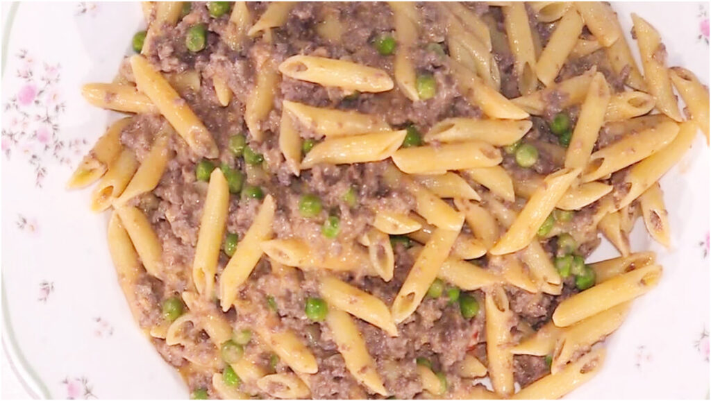 Successivamente, incorporiamo il concentrato di pomodoro e i piselli, precedentemente sbollentati, mescolando bene per fare insaporire il sugo. Lasciamo cuocere a fuoco basso fino a che il sugo non si sarà leggermente addensato. Alla fine della cottura, aggiungiamo il mascarpone e il formaggio grattugiato, mescolando fino a ottenere una crema densa e avvolgente.