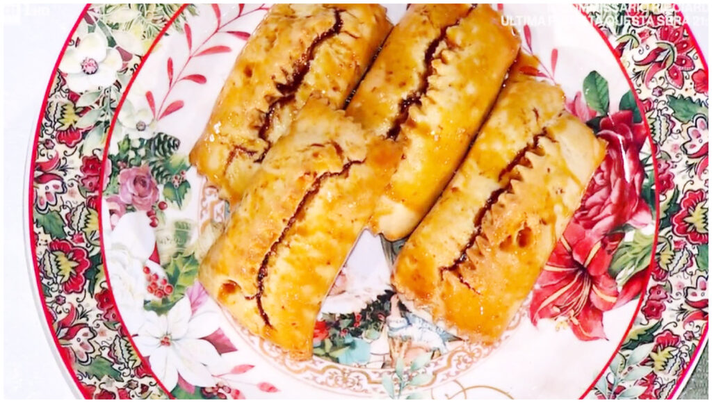 Quando sia l’impasto che il ripieno hanno riposato, stendete l’impasto con un mattarello in una sfoglia sottile, formando un rettangolo. Ritagliate dei quadrati e al centro di ciascuno ponete un cucchiaio abbondante di ripieno. Richiudete i quadrati su se stessi, come se steste preparando degli strudel in miniatura. Trasferite i biscotti su una teglia rivestita di carta da forno e cuoceteli in forno statico preriscaldato a 180°C per 15 minuti. Una volta sfornati e raffreddati, passate i biscotti nella saba e scolateli su una griglia per fare asciugare bene.