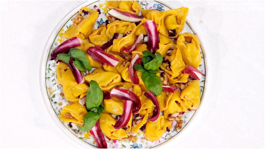 Per il condimento, in una padella sciogliamo il burro e tostiamo le noci già sgusciate e sbriciolate, aggiungendo anche le punte del radicchio tardivo. Scoliamo delicatamente i tortelli e li amalgamiamo nel condimento, aggiungendo un po’ di acqua di cottura per rendere il piatto più cremoso.