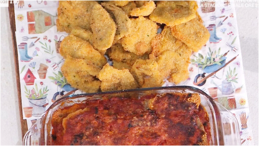 Infine, prepariamo la parmigiana di carciofi: in una pirofila, stendiamo un primo strato di passata di pomodoro precedentemente preparata con un soffritto di cipolla. Posizioniamo sopra uno strato di carciofi fritti, seguiti da un altro strato di sugo, fettine di tuma e una generosa spolverata di caciocavallo grattugiato. Ripetiamo questi strati fino a esaurire gli ingredienti, terminando con sugo e caciocavallo in superficie. Cuociamo in forno già caldo a 180°C per circa 20 minuti, fino a ottenere una bella crosticina dorata.