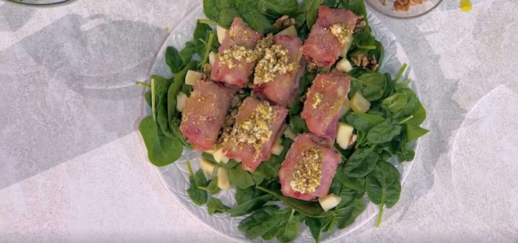 Al momento di servire, adagia gli involtini su un piatto e guarniscili con la crema di ricotta al pistacchio e una generosa spolverata di granella di pistacchi. Come contorno, condisci gli spinacini freschi con olio e sale, unendo noci e mele a dadini per un contrasto delizioso.
