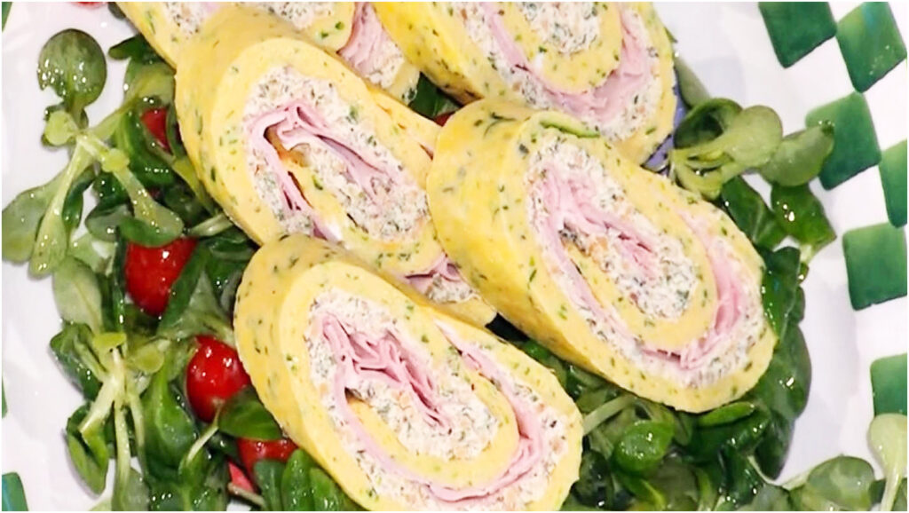 Passiamo ora a preparare la crema di robiola: lavoriamo la robiola con un po’ di olio, sale, pepe ed erbe aromatiche tritate finemente. Quando il rotolo di zucchine è cotto, lasciamolo raffreddare. Stendiamo la crema di robiola sulla superficie della frittata fredda, quindi aggiungiamo le mandorle tritate e le fette di prosciutto. Arrotoliamo il tutto con attenzione, avvolgendolo stretto, e mettiamo in frigorifero per alcune ore per far rapprendere i sapori. Prima di servire, tagliamo a fette e accompagniamo con un’insalatina di songino e pomodorini conditi con olio, sale e limone.