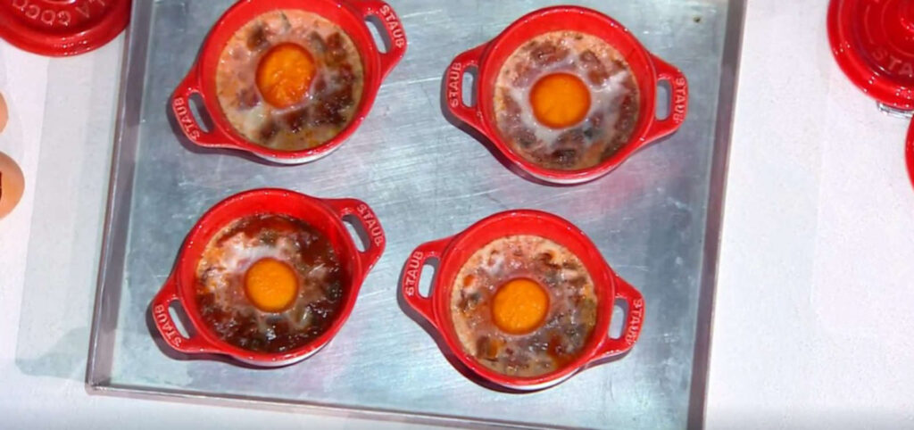 Prendiamo delle cocottine o degli stampi monoporzione in alluminio e imburriamoli generosamente. Alla base di ogni cocottina, poniamo un abbondante strato di sugo ai peperoni. Rompiamo delicatamente un uovo sopra il sugo e condiamo con sale e pepe a piacere. Ora, mettiamo le cocottine in forno preriscaldato a 180-200°C e lasciamo cuocere per 20 minuti. Durante la cottura, copriamo ogni cocottina con un foglio di alluminio per evitare che l’uovo si asciughi troppo.