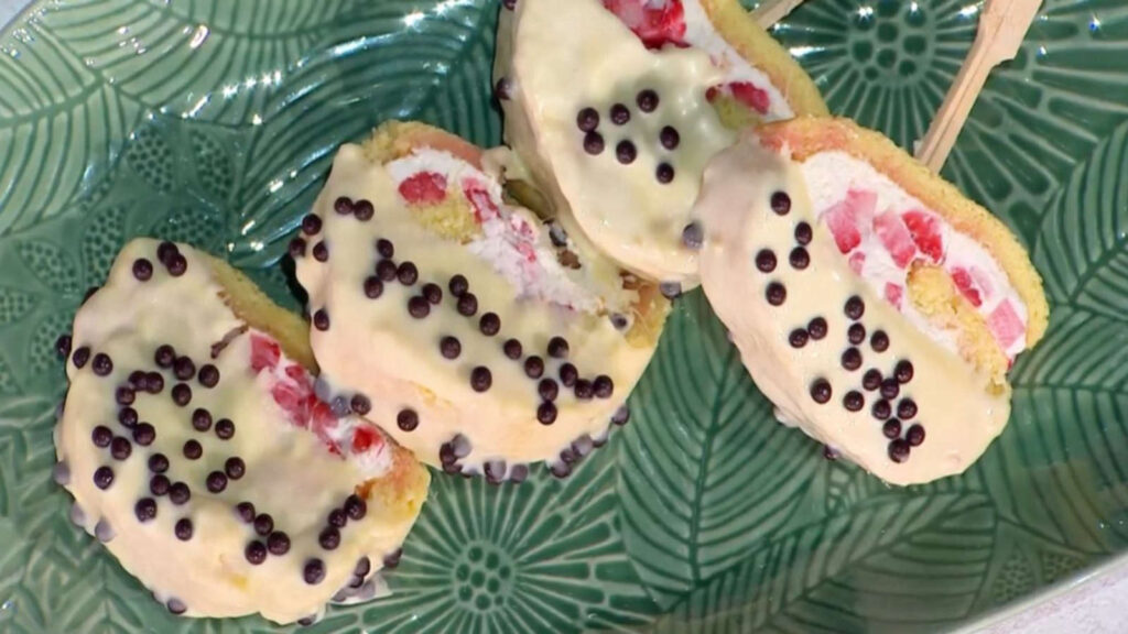 Quando il dolce si sarà rassodato, tagliatelo a fette spesse e infilate su ciascuna due stecchi da spiedino. Congelate le girandole per circa un’ora. Una volta pronte, intingete le estremità nel cioccolato bianco fuso e decorate a piacere con zuccherini colorati.