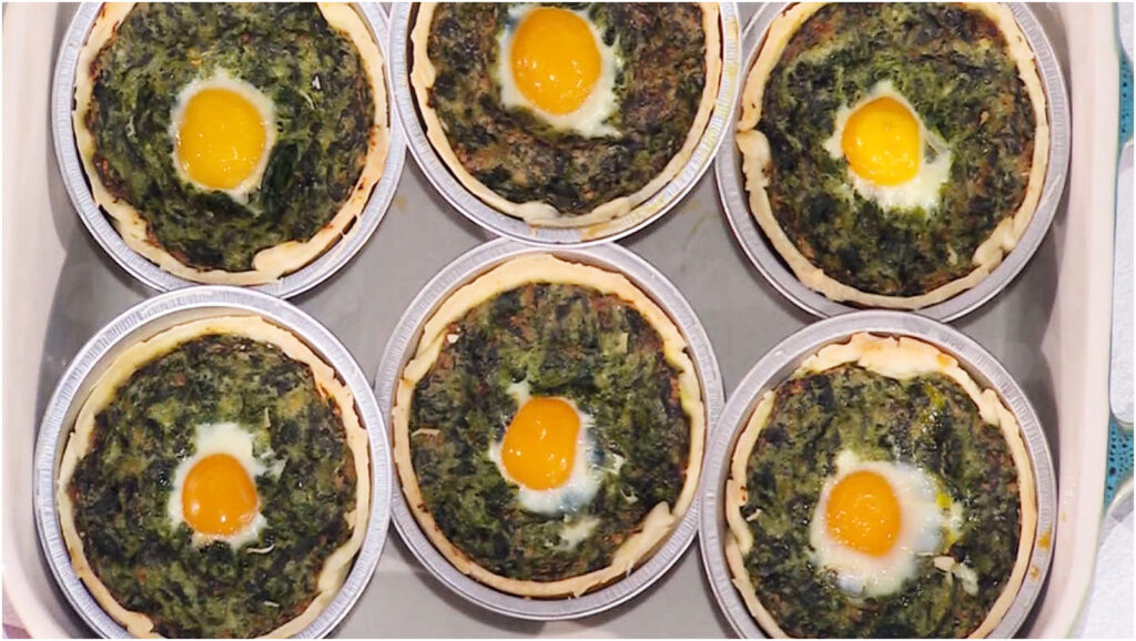 Prendiamo la pasta brisè e ricaviamo dei quadrati, che disporremo all’interno di pirottini monoporzione, foderando sia il fondo che i bordi. Riempiamo ogni pirottino con un generoso cucchiaio del ripieno di spinaci, creando un’incavatura al centro per l’uovo di quaglia. Riscaldiamo il forno a 180°C e cuociamo le mini pasqualine per circa 30 minuti. Negli ultimi 5 minuti di cottura, aggiungiamo un uovo di quaglia sgusciato nell’incavo di ciascuna tortina e completiamo la cottura.