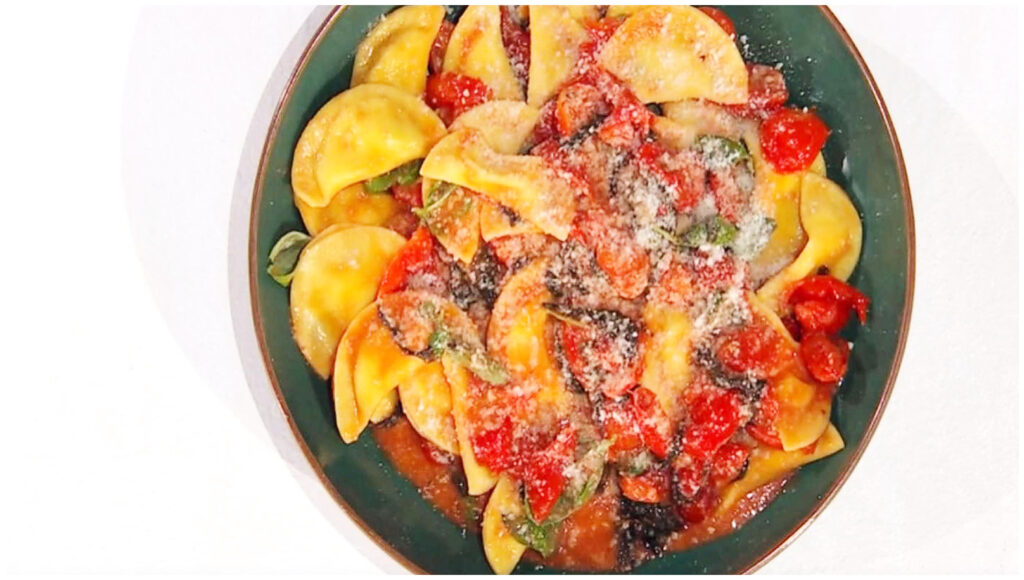 Una volta cotte, scoliamo le mezzelune e le amalgamiamo nel sugo di pomodoro. Per completare, mantechiamo con ulteriore parmigiano e pecorino grattugiati, ottenendo un piatto ricco e saporito.