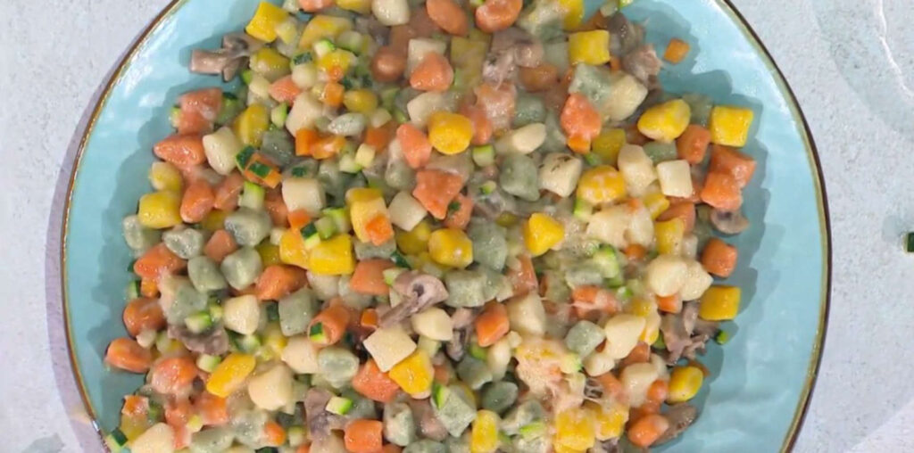 Da ciascuno di questi panetti colorati, formiamo dei serpentelli e tagliamoli in piccoli tocchetti. Cuociamo gli gnocchi in abbondante acqua bollente e salata per qualche minuto, fino a quando non vengono a galla. Nel frattempo, prepariamo il condimento: in una padella, sciogliamo il burro aggiungendo le foglie di timo. Aggiungiamo le verdure tagliate a dadini, come carote, zucchine e funghi, e lasciamo stufare. Una volta pronti, scoliamo gli gnocchi e saltateli nella padella con il condimento, mantecando con un ulteriore po’ di formaggio grattugiato e una noce di burro, fino a ottenere un amalgama cremoso.