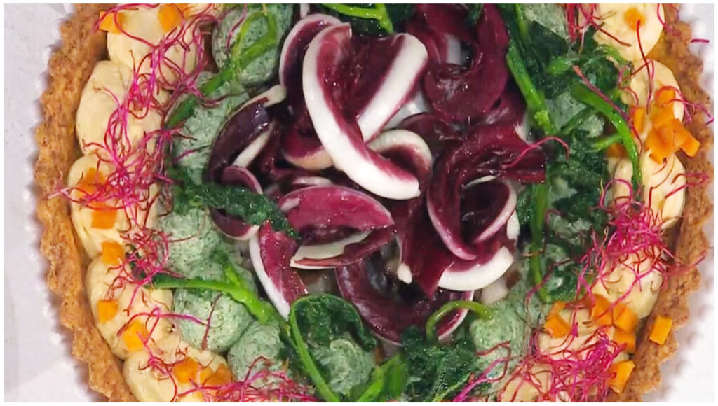 Prendiamo il nostro panetto di frolla dal frigorifero e stendiamolo per foderare una teglia per crostate. Copriremo con carta forno e legumi, quindi inforniamo a 180° per 20 minuti, rimuovendo i legumi e la carta negli ultimi 5 minuti di cottura. Una volta sfornata e raffreddata la base, spalmiamo sul fondo la polpa di zucca e decoriamo con ciuffi di crema di zucca e crema di cime di rapa. Al centro disponiamo il radicchio stufato e completiamo con cubetti di zucca e cime di rapa saltate.