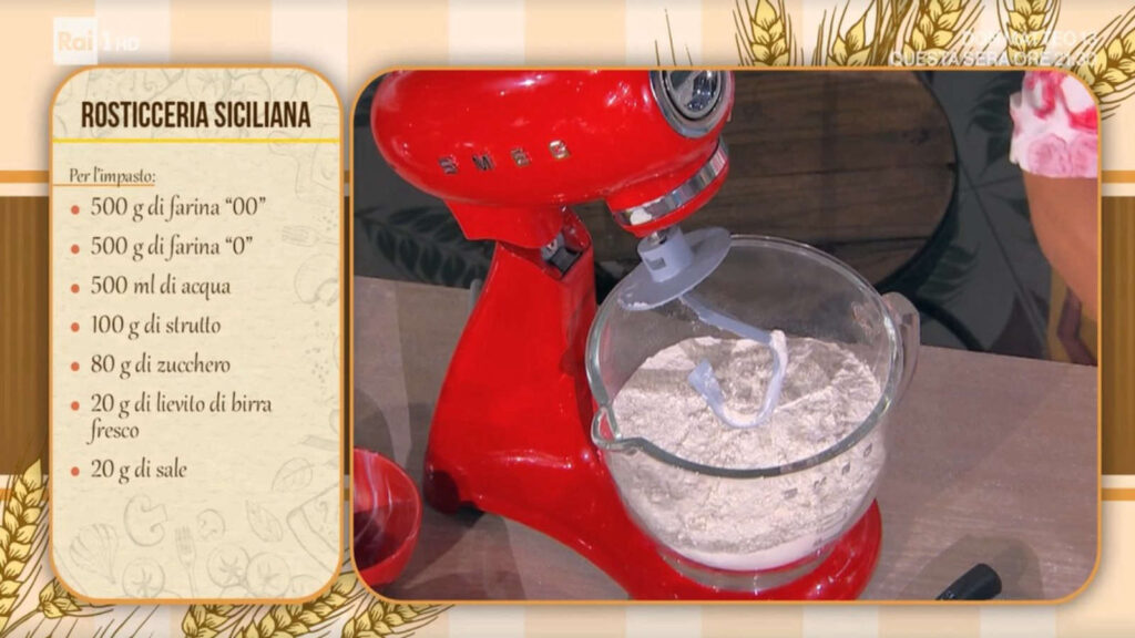 Per iniziare la preparazione della rosticceria, prendete una grande ciotola o utilizzate una planetaria per mescolare le due farine, la farina 00 e quella di semola. Una volta amalgamate, sbriciolate al loro interno il lievito di birra fresco e aggiungete la maggior parte dell’acqua tiepida insieme a un cucchiaino di zucchero. Cominciate a impastare utilizzando il gancio della planetaria oppure, se preferite, le mani, fino a ottenere un composto omogeneo.